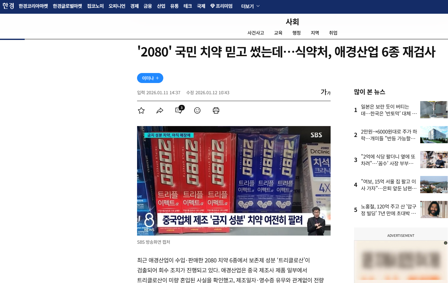 [한국경제] '2080' 국민 치약 믿고 썼는데... 식약처, 애경산업 6종 재검사