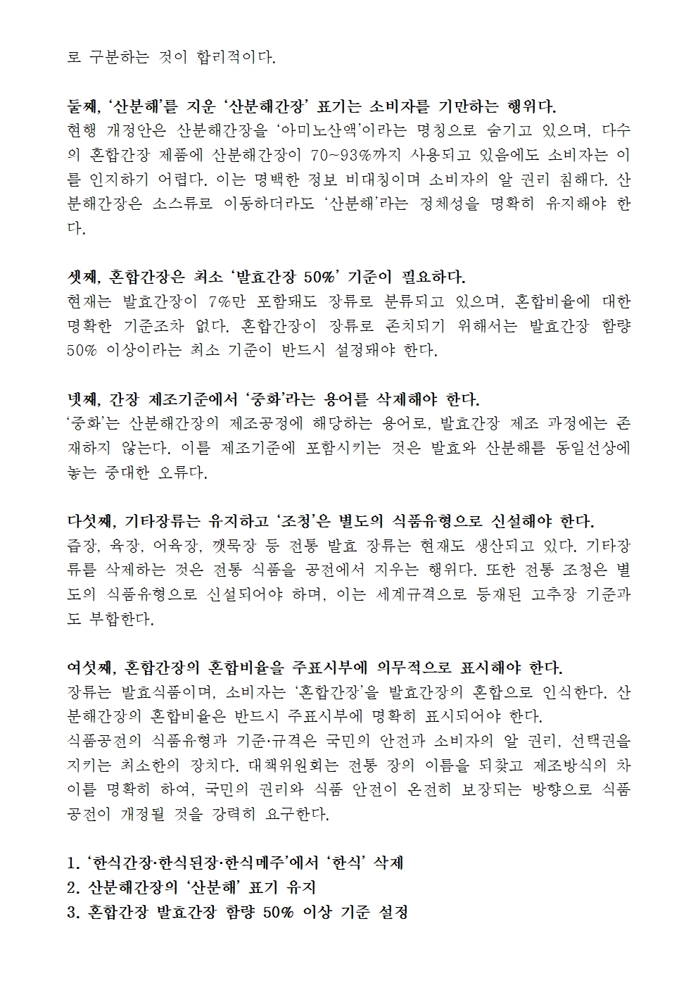 [공동성명서]식품공전 장류 분류체계, 전통과 소비자 권리를 훼손하는 개정안...hwp