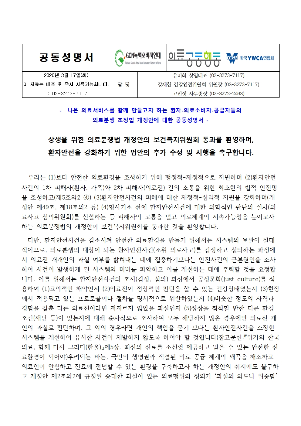 (공동성명서)의료분쟁법 개정안 통과 관련 성명서_GCN녹색소비자연대.hwp