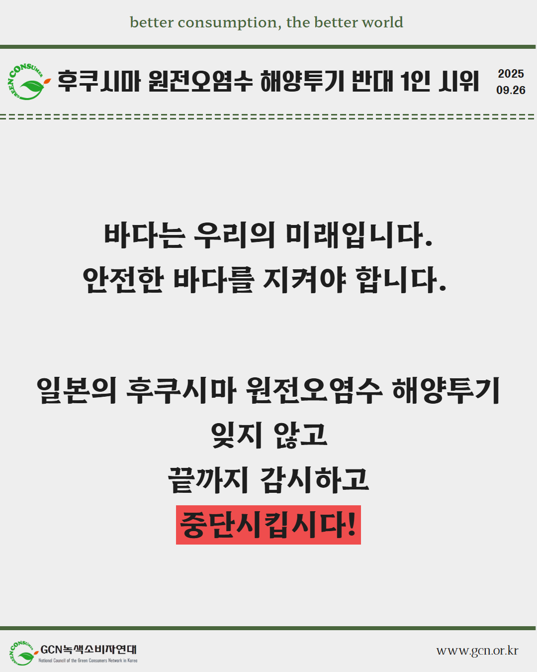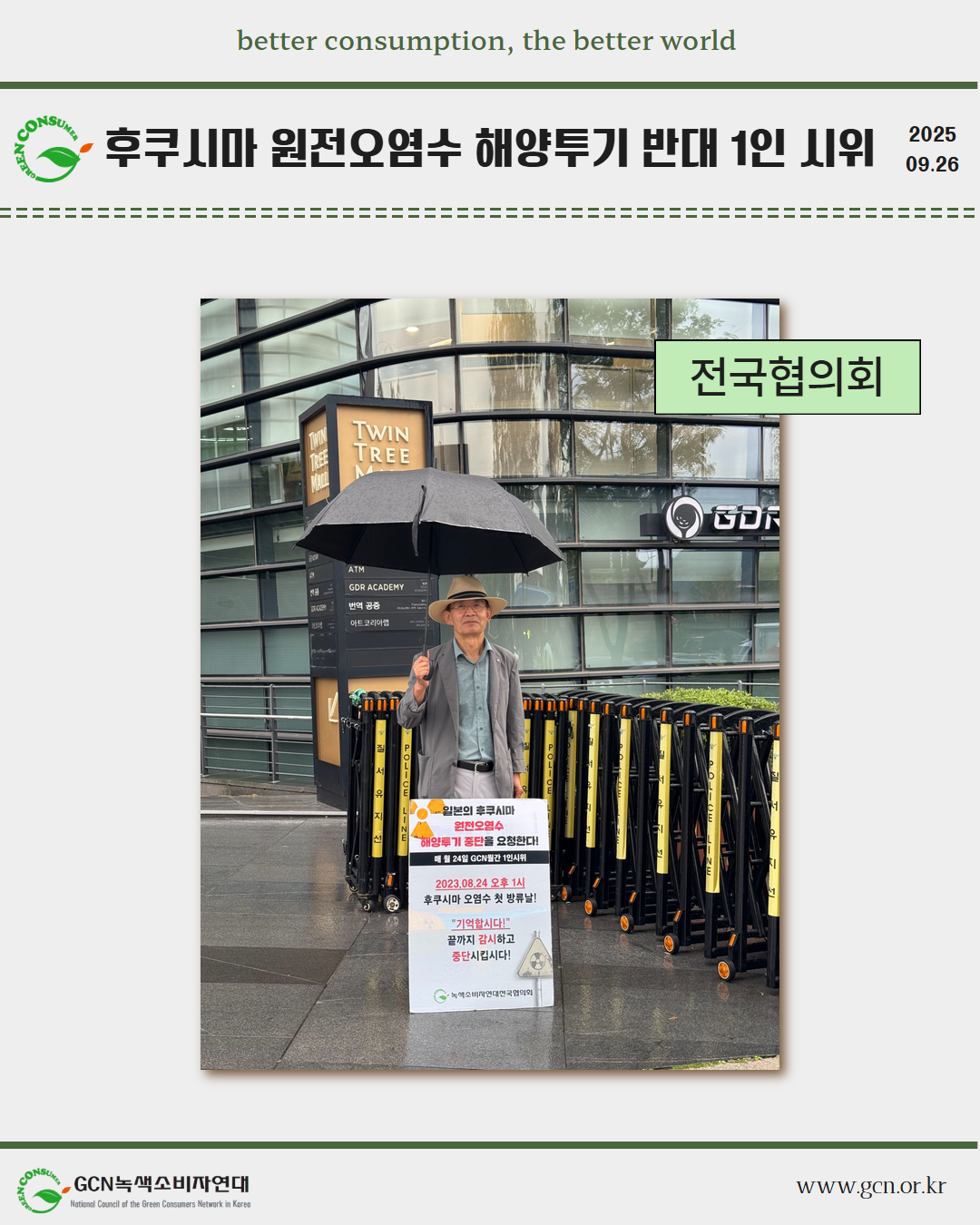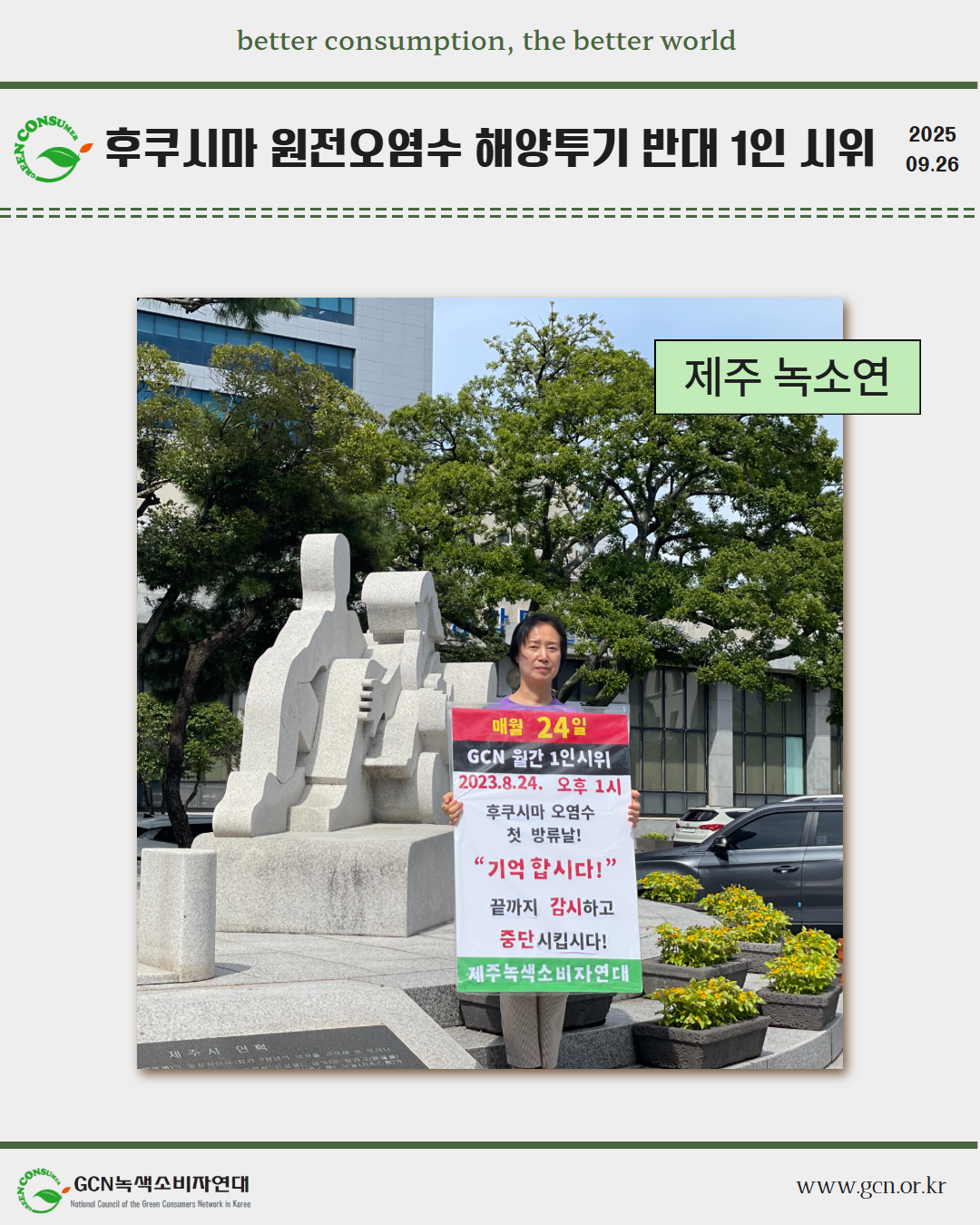 일본이 원전오염수 해양 투기를 시작했던 8월 24일을 잊지 않고, GCN 녹색소비자연대는 매월 24일 전국에서 1인 시위를 이어가고 있습니다.
