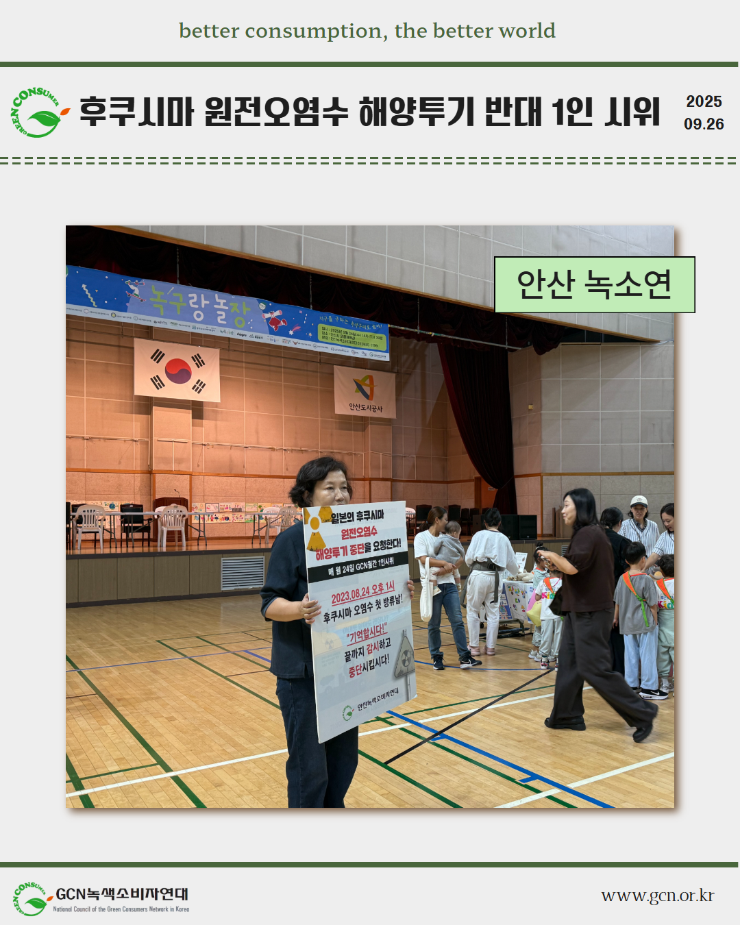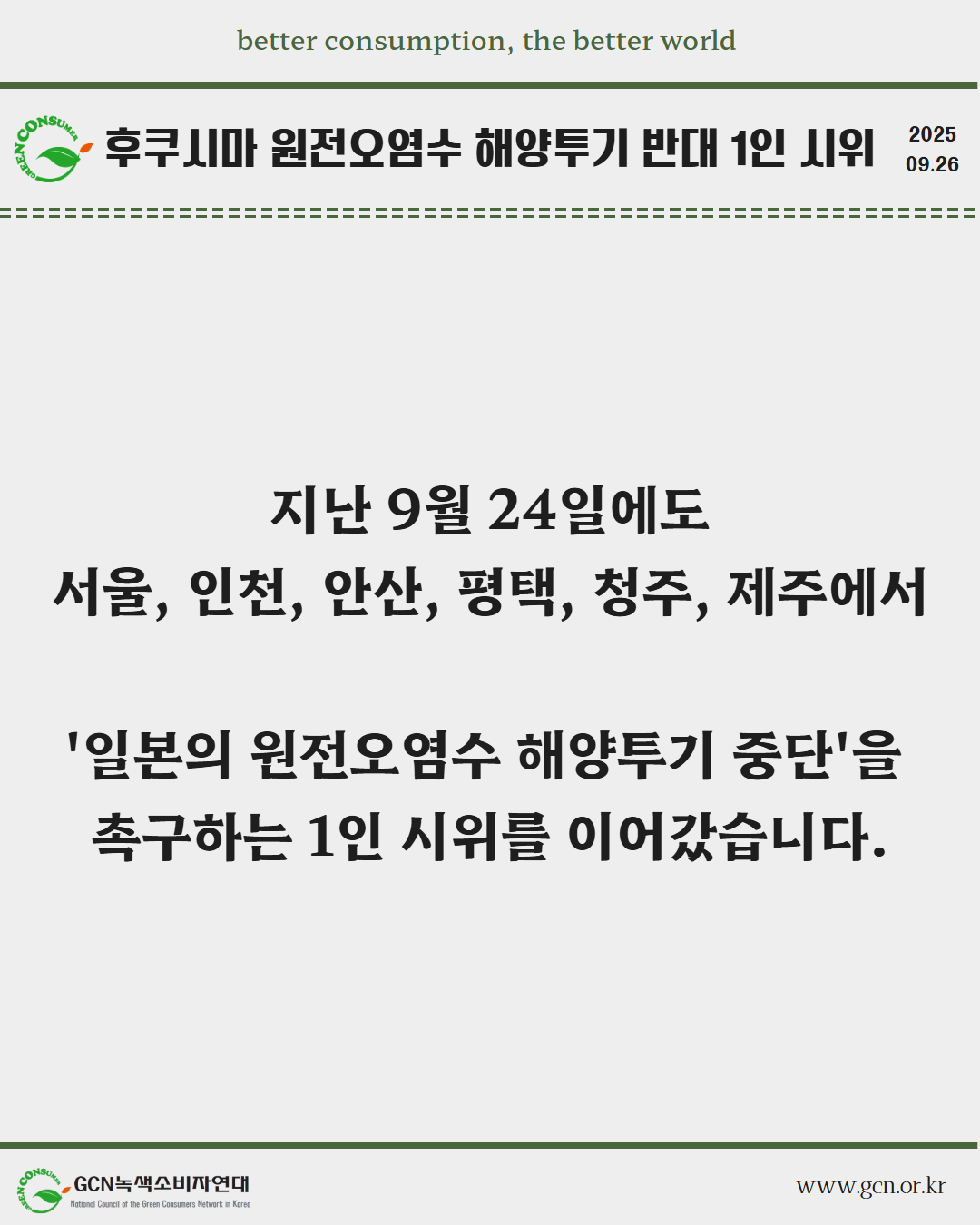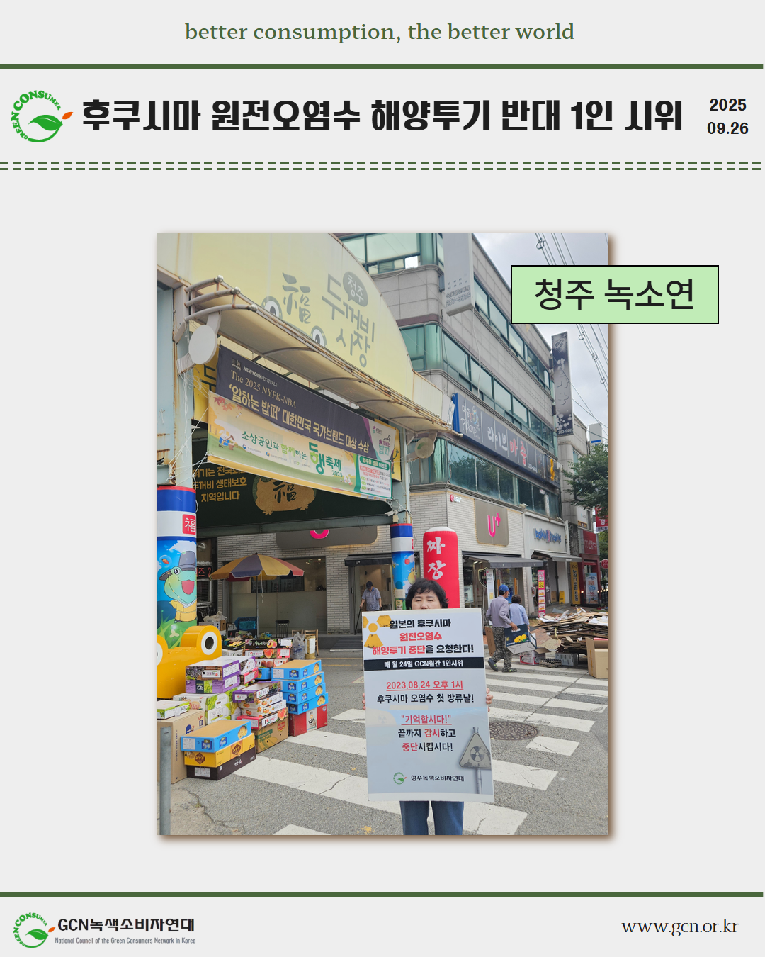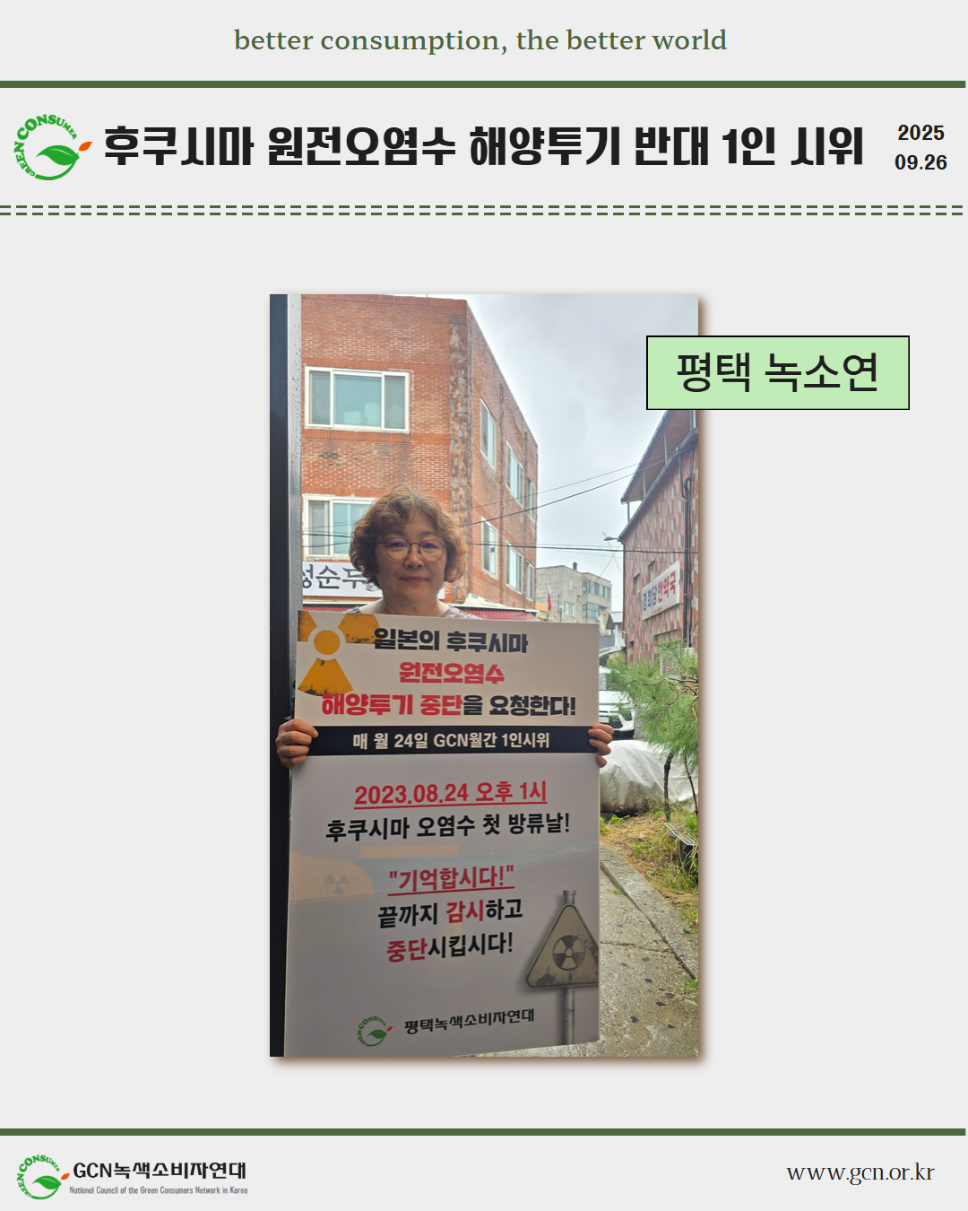 일본이 원전오염수 해양 투기를 시작했던 8월 24일을 잊지 않고, GCN 녹색소비자연대는 매월 24일 전국에서 1인 시위를 이어가고 있습니다.