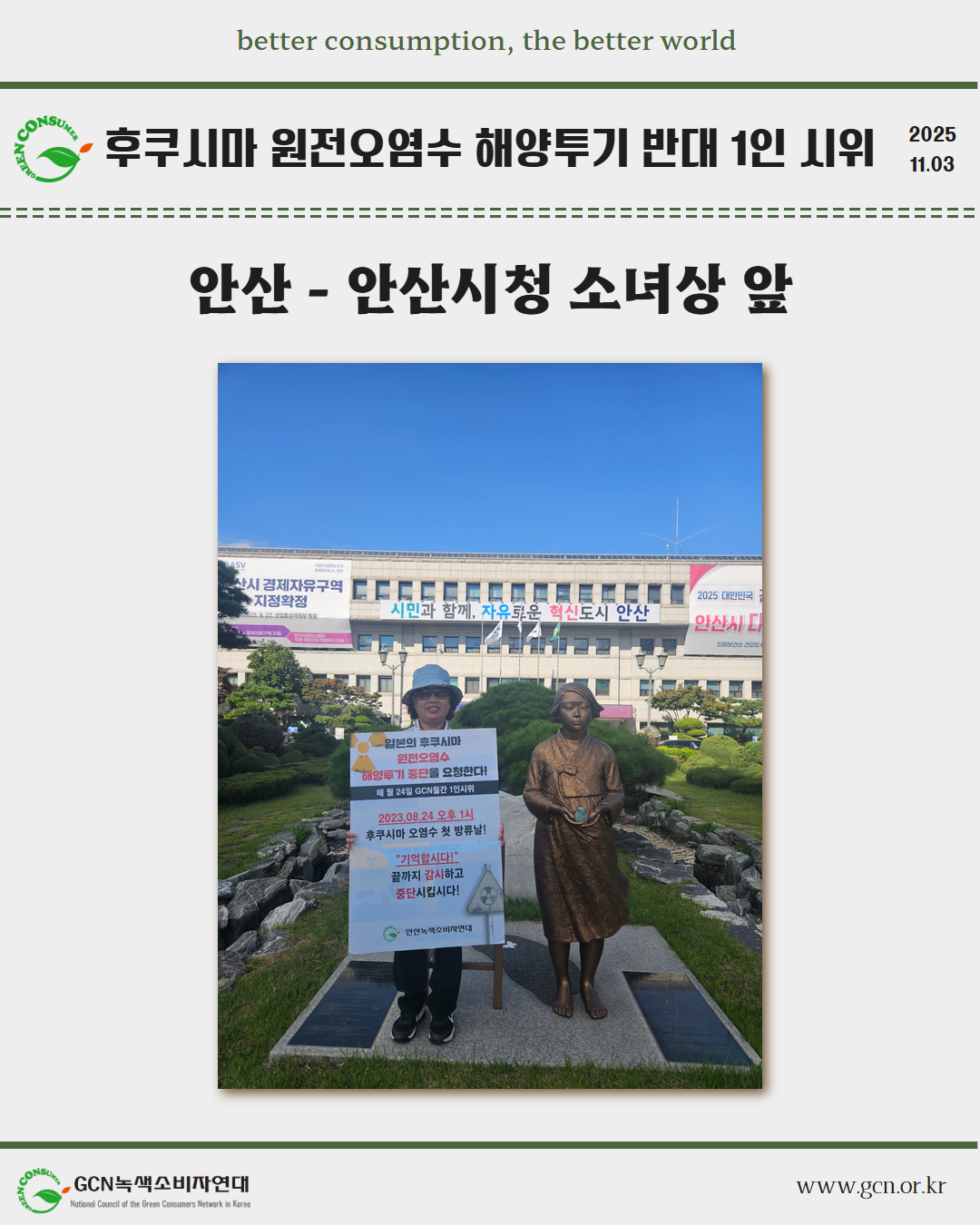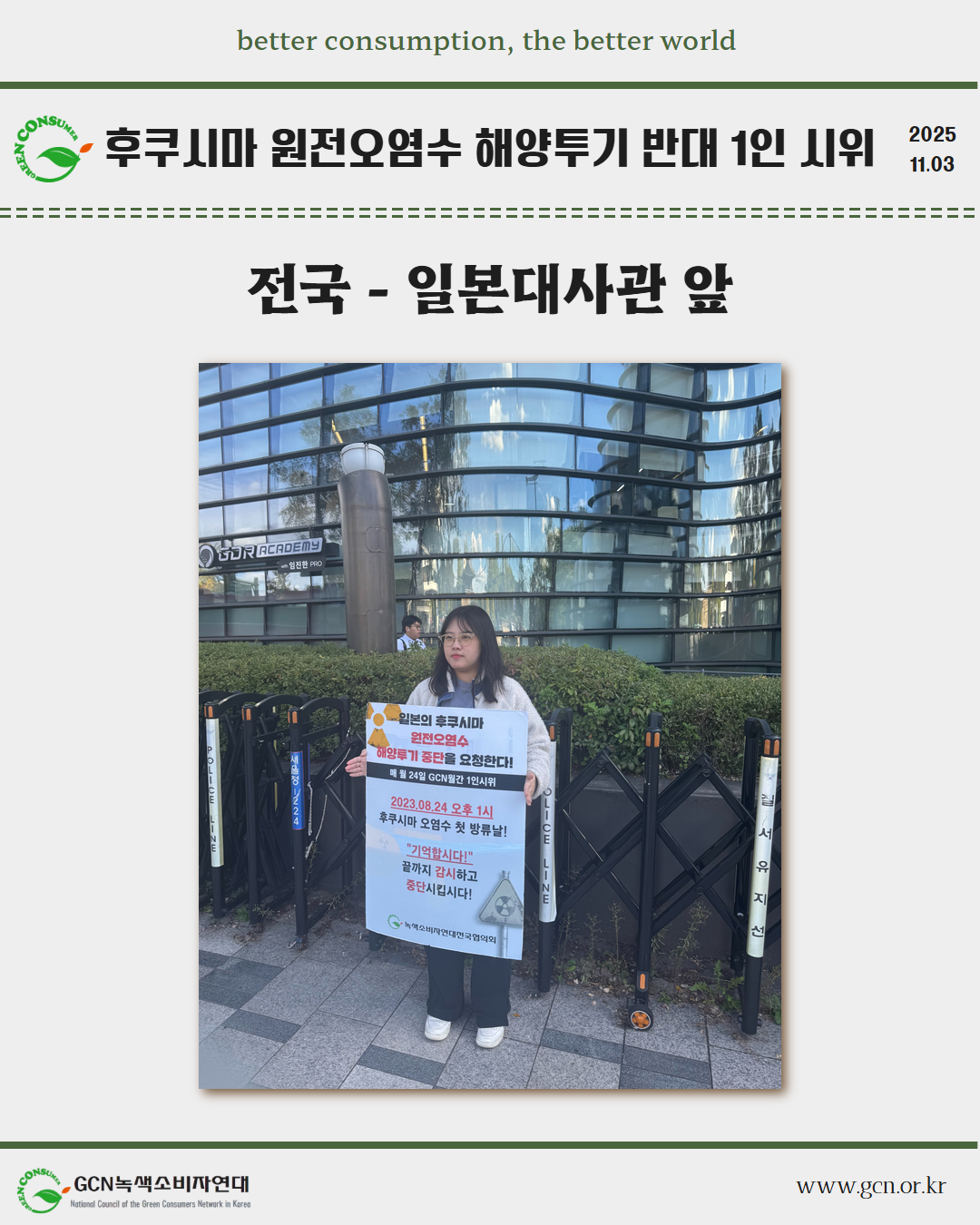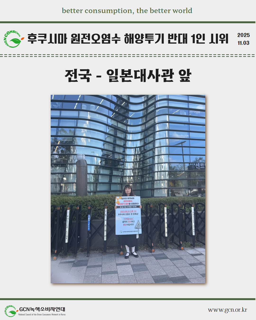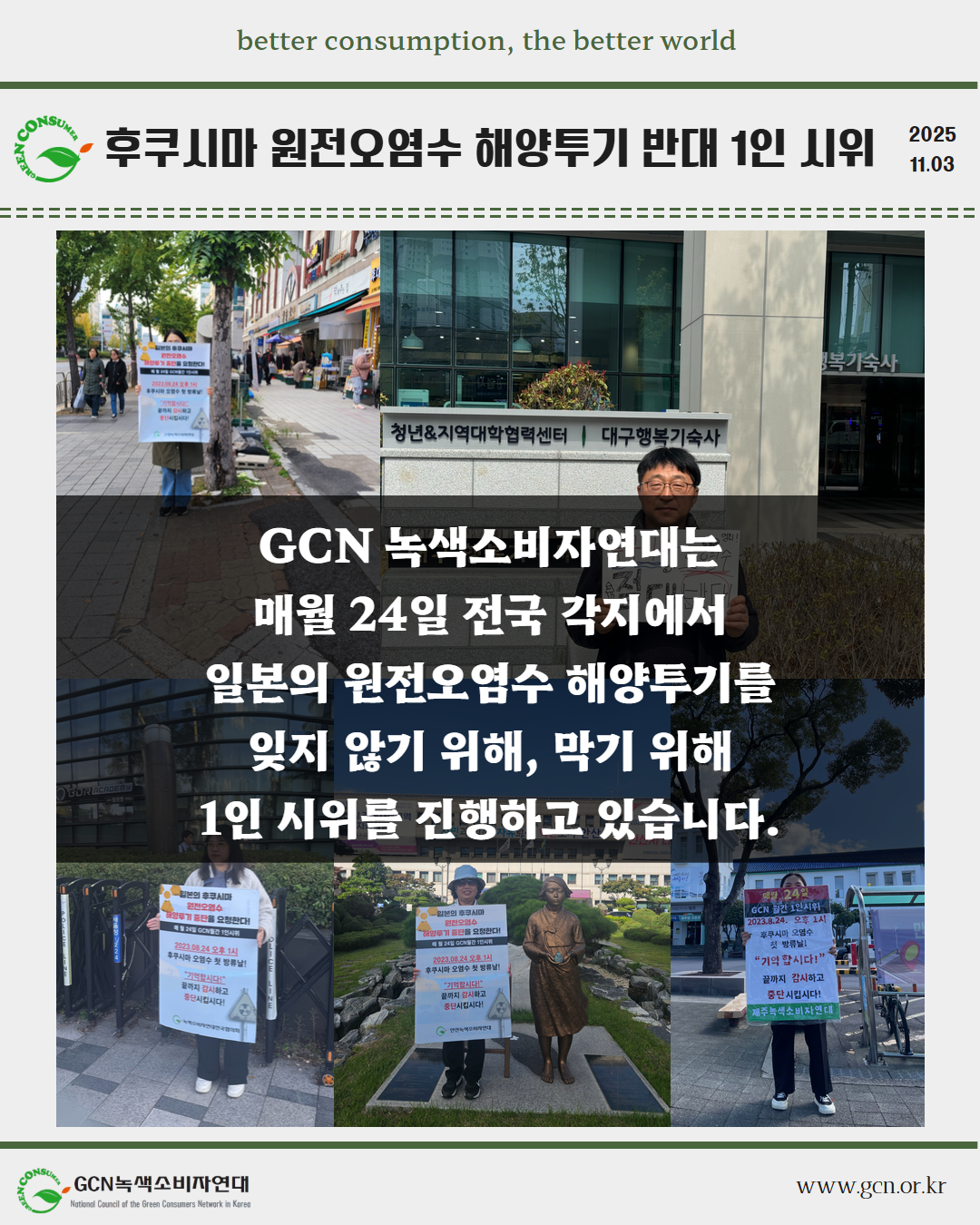 GCN 녹색소비자연대는 매월 24일 전국 각지에서 일본이 원전오염수 해양 투기를 시작했던 8월 24일을 잊지 않고, 1인 시위를 이어가고 있습니다.