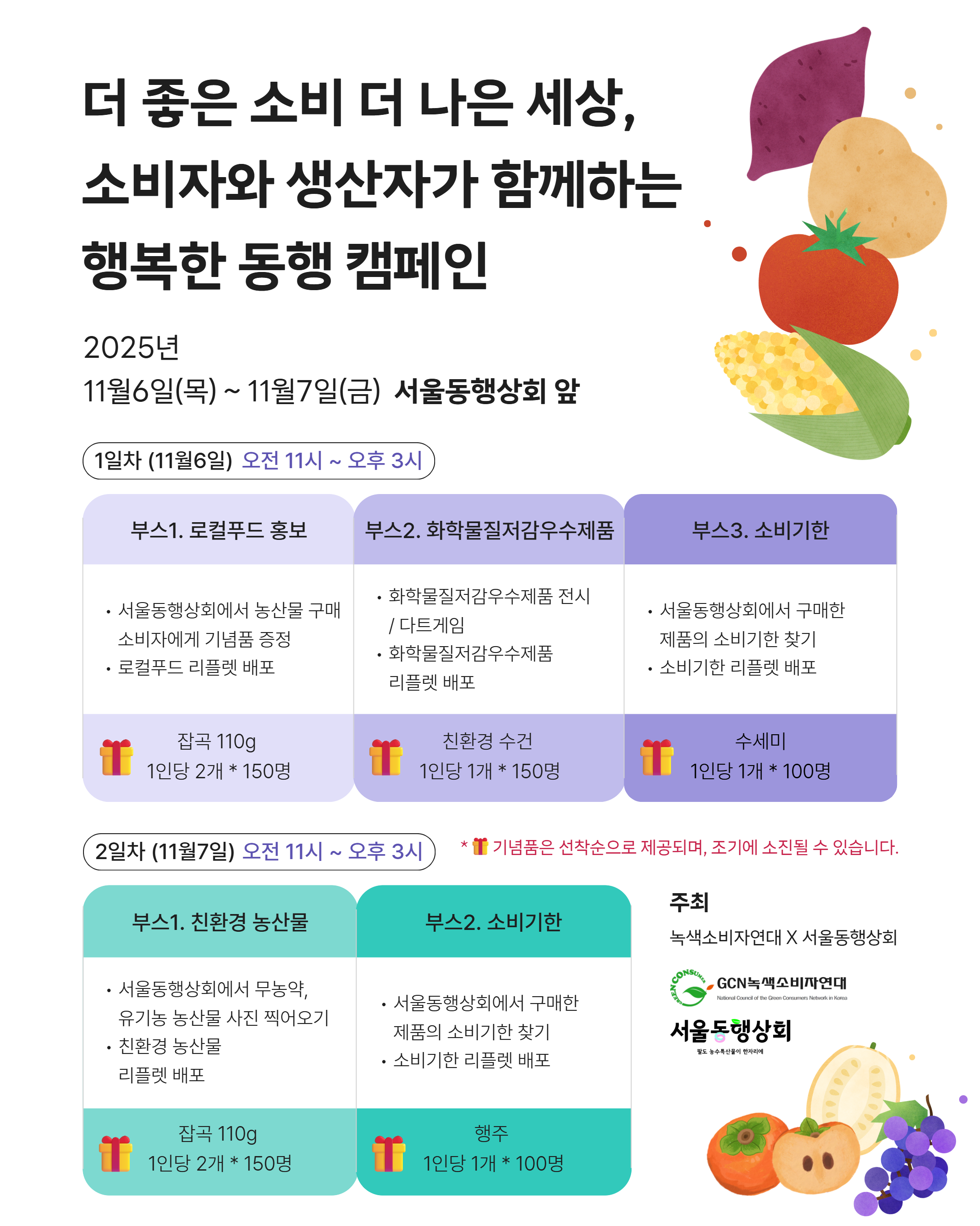 녹색소비자연대 X 서울동행상회 ‘더 좋은 소비 더 나은 세상, 소비자와 생산자가 함께하는 행복한 동행’ 캠페인 ● 11월 6일(목)~7일(금) 오전11시 ~ 오후3시 ● 서울동행상회 앞 로컬푸드 · 화학물질저감우수제품 · 소비기한 · 친환경농산물 부스 참여하고 기념품도 받아가세요! *기념품은 선착순으로 제공되며, 조기에 소진될 수 있습니다. #gcn #녹색소비자연대 #gcn녹색소비자연대 #행복한동행 #서울동행상회 #로컬푸드 #화학물질저감우수제품 #소비기한 #친환경농산물 |