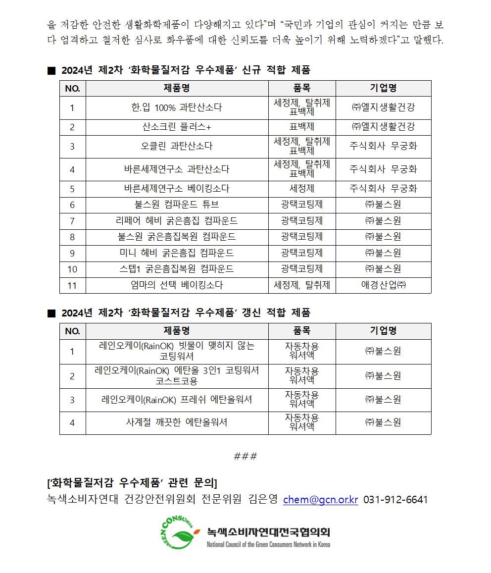 [보도자료] 녹색소비자연대, 유해물질 줄인 ‘화학물질저감 우수제품’ 11개 신규 선정