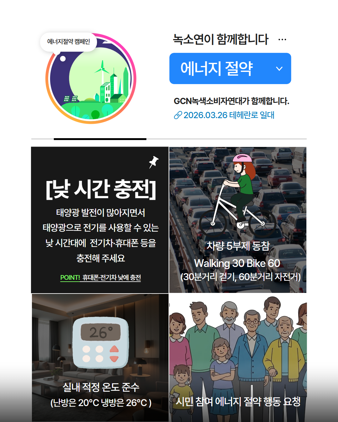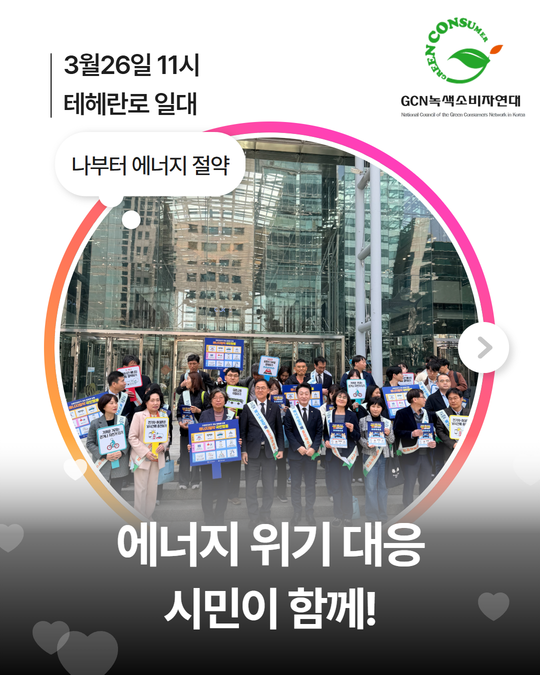 기후위기와 에너지 불안정 속에서 지금 필요한 것은 거창한 구호보다 시민 한 사람, 한 사람의 실천입니다. GCN녹색소비자연대는 3월 26일 오전 11시, 테헤란로 일대에서 한국에너지공단, 에너지시민연대, 에코허브 등 시민단체와 에너지절약 캠페인을 진행했습니다. 우리가 함께할 수 있는 실천은 어렵지 않습니다. ✔ 대중교통 이용하기 ✔ 전기차·휴대폰은 낮 시간에 충전하기 ✔ 실내 적정온도 지키기 (난방 20℃ / 냉방 26℃) ✔ 불필요한 조명 끄기 에너지 위기 대응의 시작은 바로 일상 속 작은 실천입니다. 시민참여는 극복의 정치입니다. 더 좋은 소비, 더 나은 세상을 위해 녹색소비자연대가 함께하겠습니다. #GCN녹색소비자연대 #녹색소비자연대 #에너지절약 #에너지위기 #시민참여 #기후위기대응 #탄소중립 #녹색전환 #생활실천 #대중교통이용 #낮시간충전 #적정온도지키기 #불끄기실천 #한국에너지공단 #녹소연