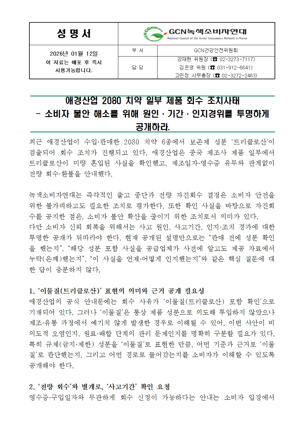 [성명서] 애경산업 2080 치약 일부 제품 회수 조치사태 - 소비자 불안 해소를 위해 원인·기간·인지경위를 투명하게 공개하라.