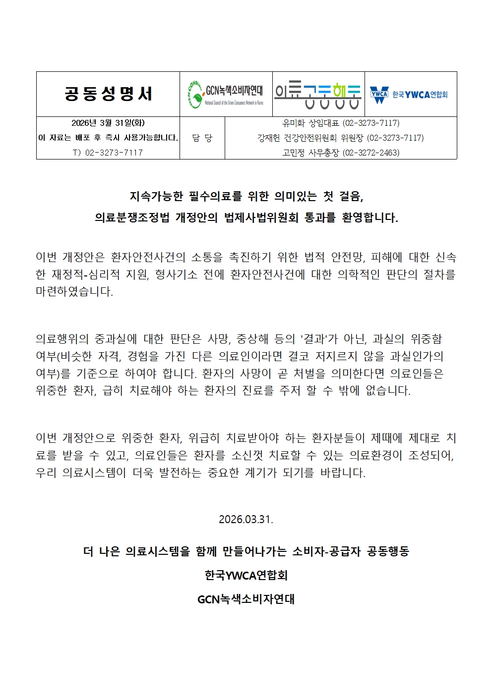 [공동성명서]의료분쟁조정법 개정안의 법제사법위원회 통과를 환영합니다.