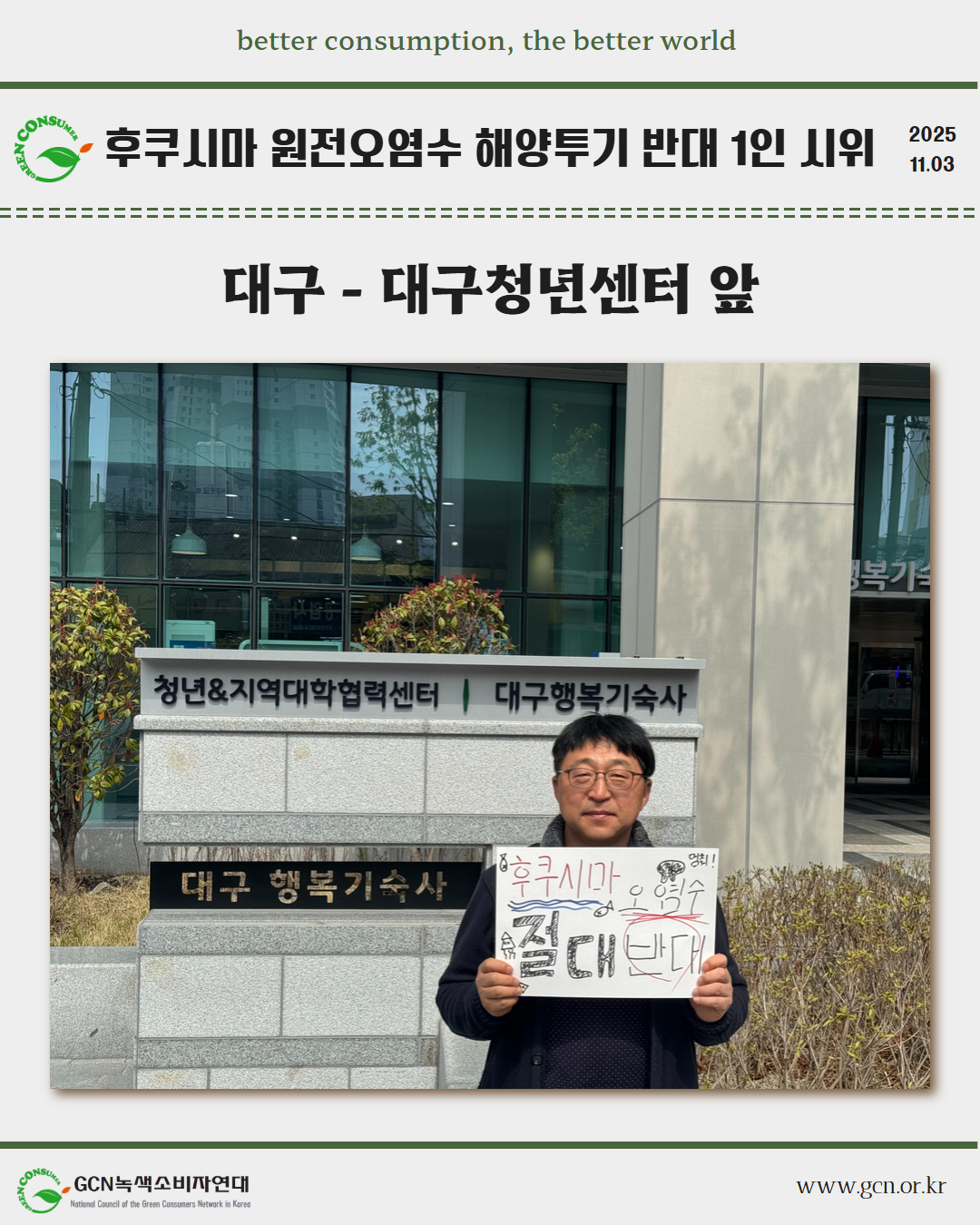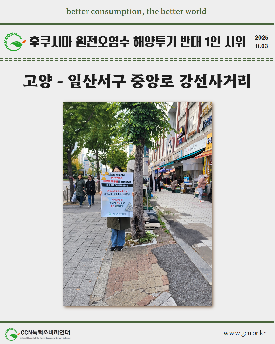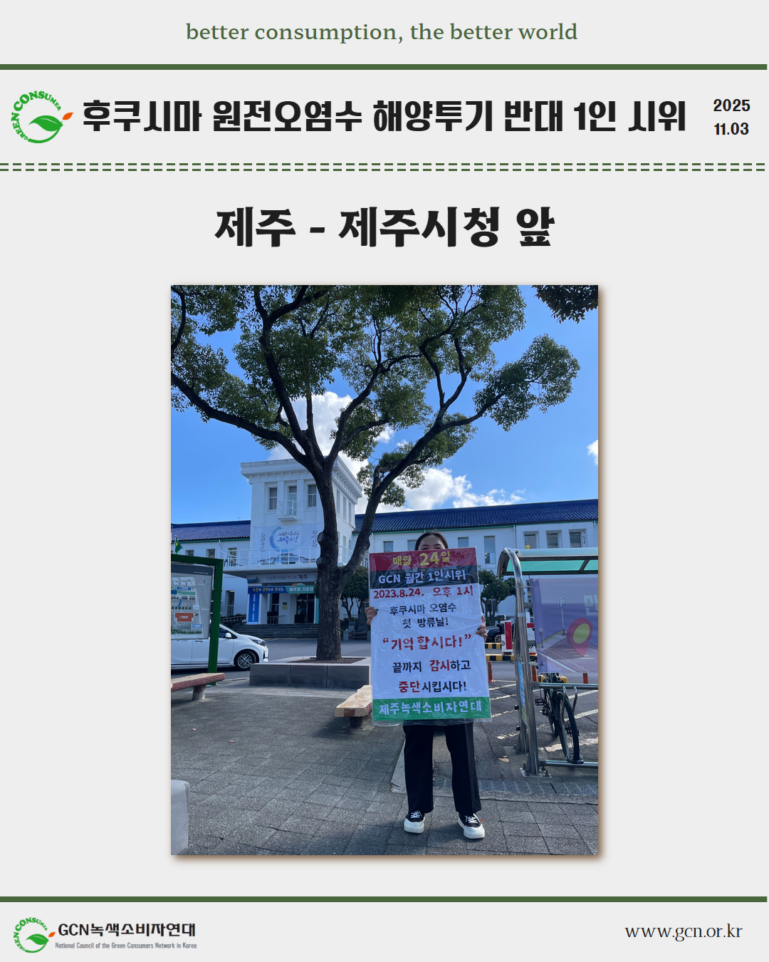 GCN 녹색소비자연대는 매월 24일 전국 각지에서 일본이 원전오염수 해양 투기를 시작했던 8월 24일을 잊지 않고, 1인 시위를 이어가고 있습니다.