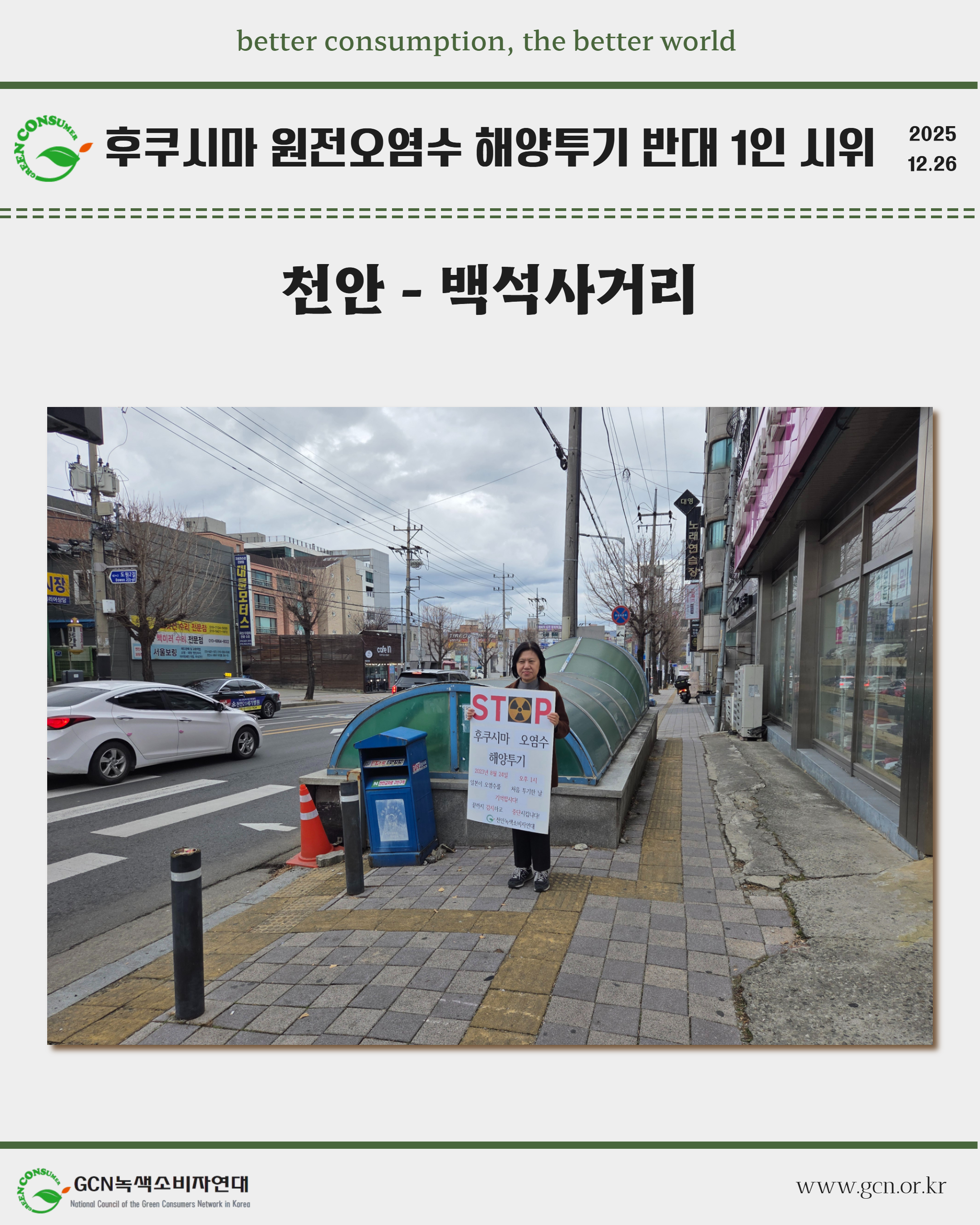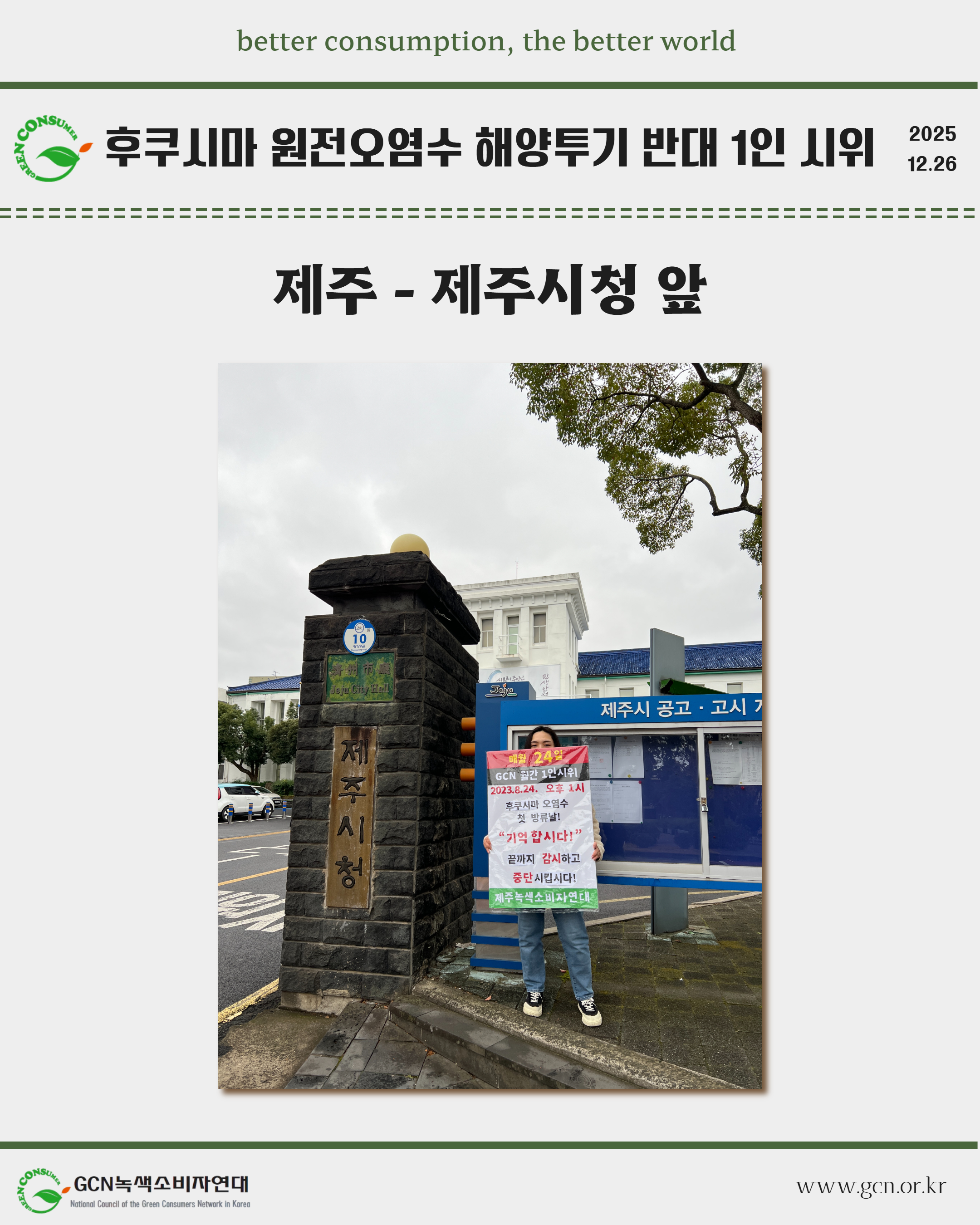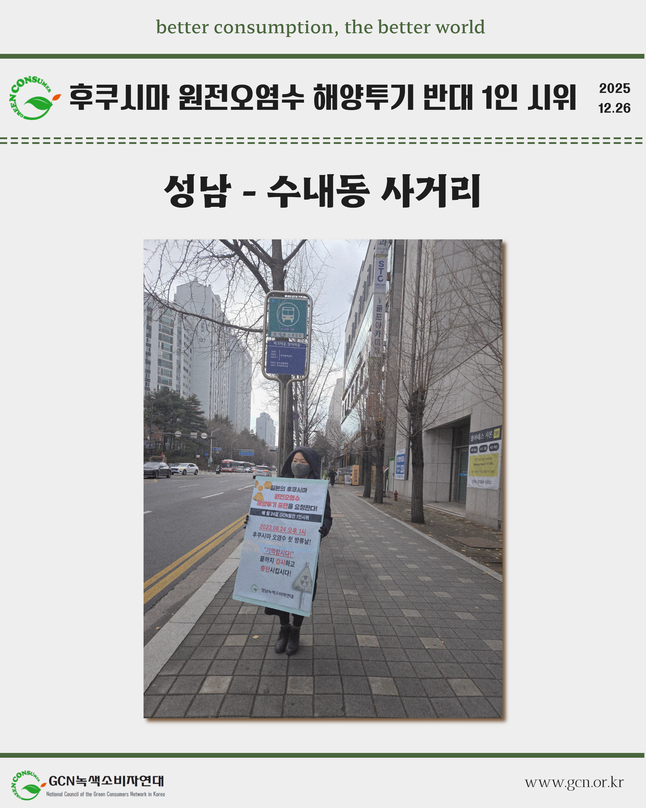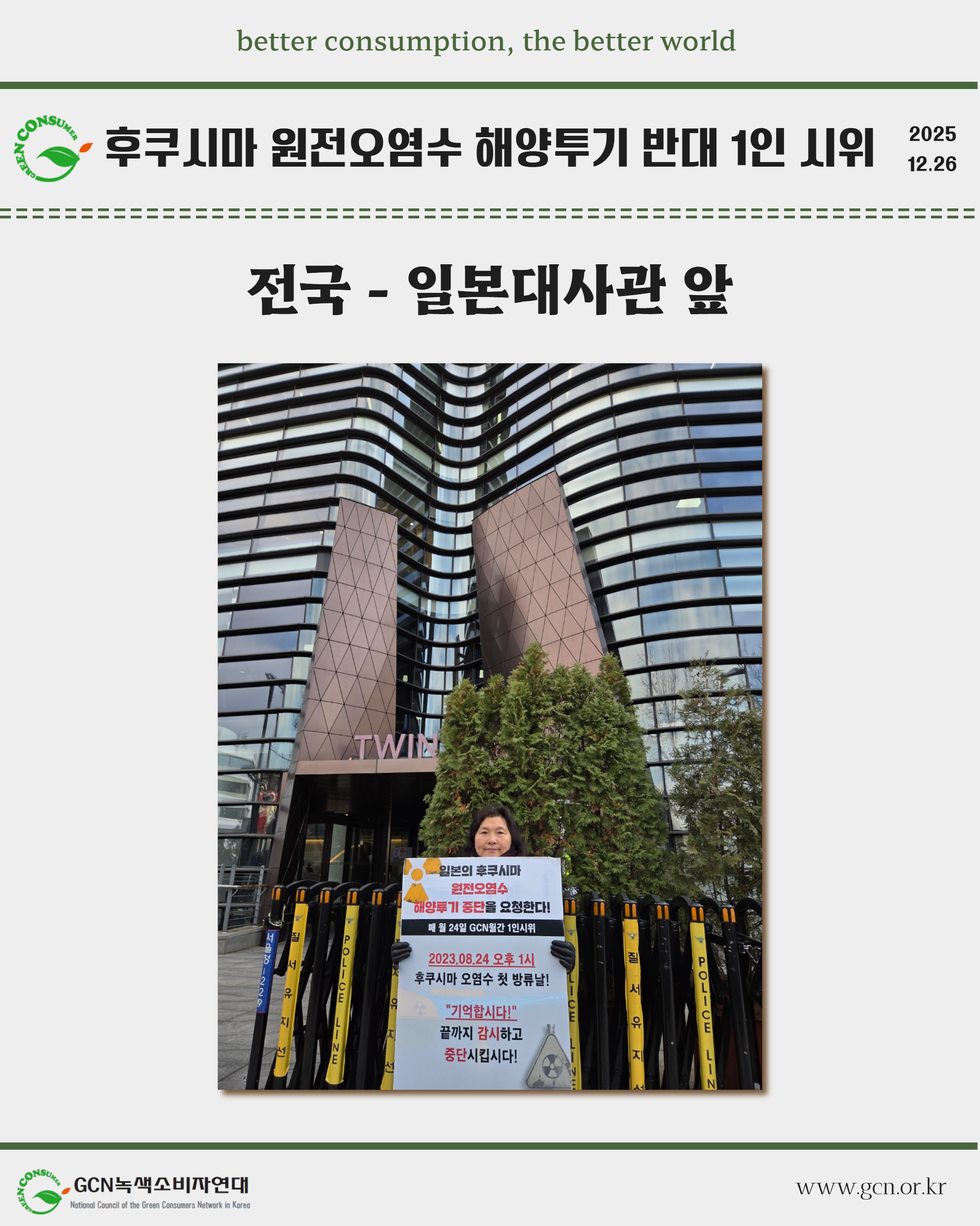 일본이 원전오염수 해양 투기를 시작했던 2023년 8월 24일을 잊지 않고, GCN 녹색소비자연대는 매월 24일 전국에서 1인 시위를 이어가고 있습니다.