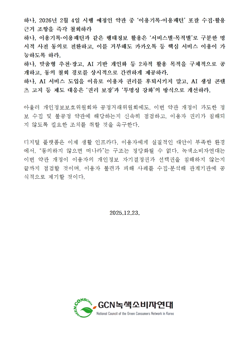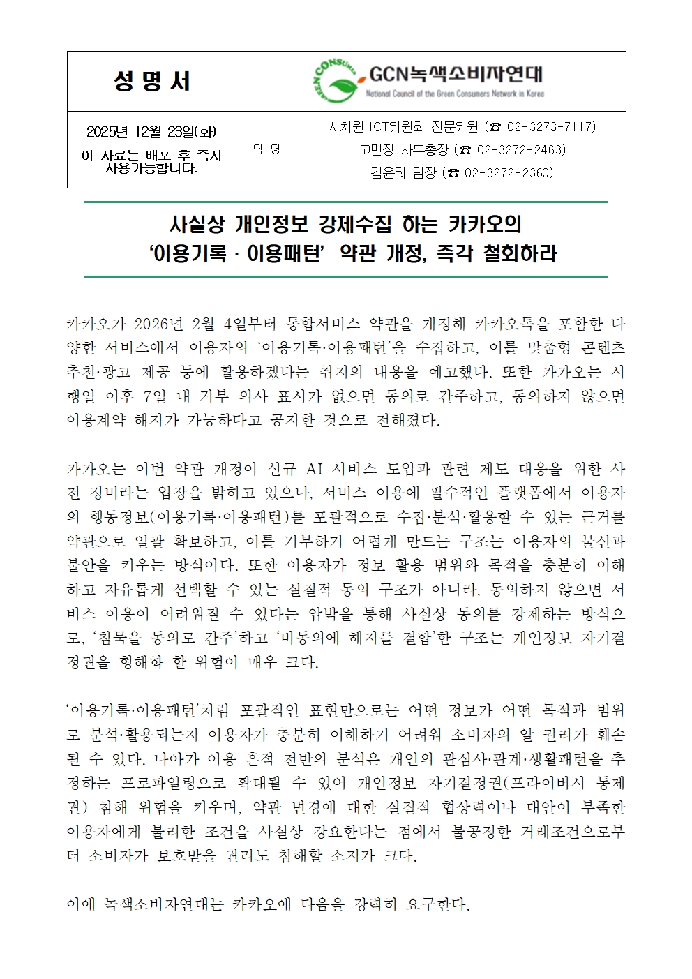 [GCN소비자위원회]카카오의 강제수집 약관 철회_성명서.hwp